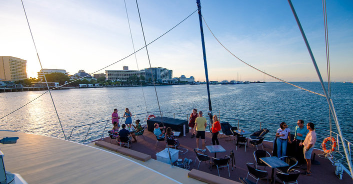 Cairns Dinner Cruise is the perfect way to end a perfect day in paradise. Set sail aboard our newly refurbished 26-metre catamaran on the calm waters of Trinity Inlet, for an evening of dining, entertainment, and panoramic mountain and city views. Throughout the evening you'll cruise the calm water of the inlet and waterfront of Cairns, whilst enjoying fabulous dining, live music and dancing after dinner.